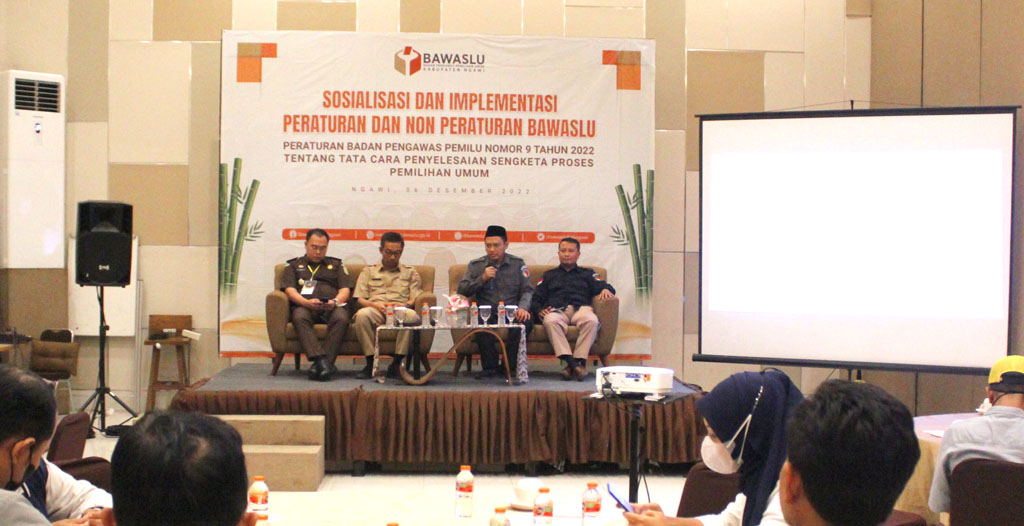 Yusron Habibi Ketua Bawaslu Ngawi dalam sambutanya mengatakan " Perbawaslu Nomor 9 Tahun 2022 tentang Penyelesaian sengketa proses pemilu merupakan atauran ataupun regulasi yang harus kita pahami bersama guna mengetahui upaya upaya pecegahan yang dilakukan bawaslu sebelum terjadinya sengketa proses pemilu, Penyelesaikan Sengketa merupakan terobosan Undang-undang Pemilu yang memberi wewenang Bawaslu untuk menanganinya dengan proses non litigasi sehingga prosesnya bisa dilakukan dengan cepat dan tanpa biaya. Sengketa bisa terjadi antara Peserta Pemilu dengan KPU atau Peserta Pemilu dengan Peserta Pemilu".