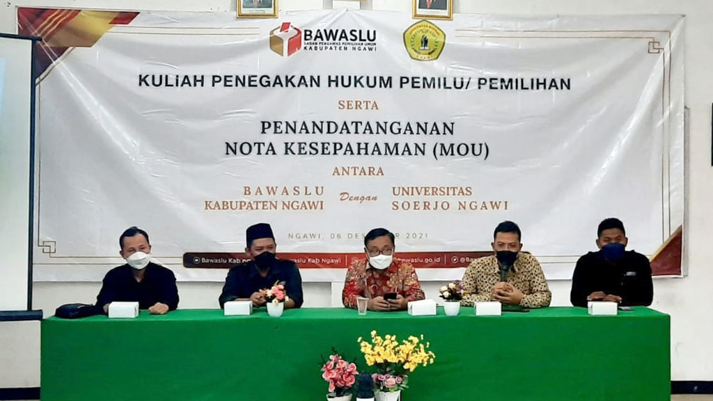Ngawi, Bawaslu Kabupaten Ngawi - Hari ini, Senin (6/12/2022) Kegiatan Kuliah Umum sekaligus Penandatanganan Nota Kesepahaman (MoU) antara Bawaslu Ngawi dengan Universitas Soerjo Ngawi dilaksanakan di Gedung Pertemuan Universitas Soerjo. Kuliah Umum disampaikan oleh Koordinator Penanganan Pelanggaran Bawaslu Jawa Timur Muh. Ikhwanudin Alfianto dan di Moderatori Syaifudin Anggota Bawaslu Ngawi. Perlu diketahui Kampus UNSOER merupakan Perguruan Tinggi di Ngawi yang mempunyai satu- satunya Fakultas Hukum.