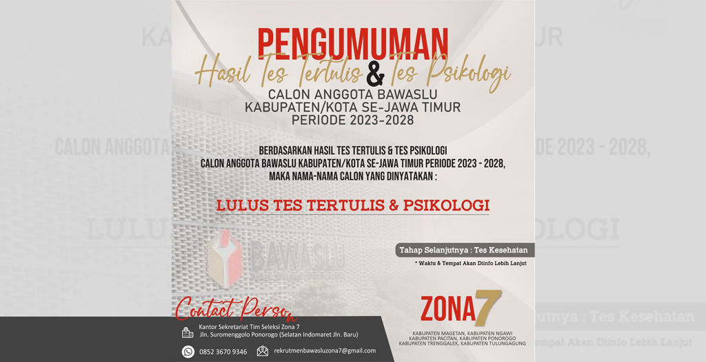 Ngawi, Bawaslu Kabupaten Ngawi - Dalam rangka melaksanakan amanat Undang-Undang Nomor 7 Tahun 2017 tentang Pemilihan Umum setelah melakukan penilaian atas Tes Tertulis dan Tes Psikologi Calon Anggota Bawaslu Kabupaten/ Kota Zona 7, bersama ini kami umumkan nama-nama yang lulus seleksi Tes Tertulis dan Tes Psikologi Calon Anggota Bawaslu Kabupaten/ Kota – Zona 7, sebagai berikut :