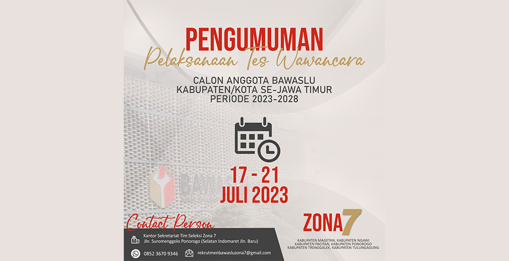PENGUMUMAN PELAKSANAAN TES WAWANCARA CALON ANGGOTA BAWASLU KABUPATEN/KOTA ZONA 7 MASA JABATAN 2023-2028