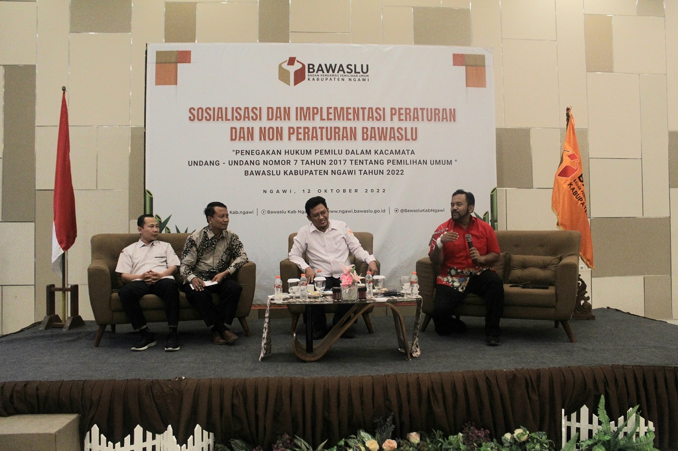 Ngawi, Bawaslu Kabupaten Ngawi melaksanakan Sosialisasi dan Implementasi Peraturan dan Non Peraturan Bawaslu dalam kerangka Undang - Undang Nomor 7 Tahun 2017 Tentang Pemilihan Umum, yang dilaksanakan hari ini, Rabu (12/10/2022) di Ngawi, dengan Moderator Chairul Anam Anggota Bawaslu Ngawi serta Narasumber Purnomo Satriyo Pringgodigdo Anggota Bawaslu Provinsi Jawa Timur Divisi Hukum, Pendidikan dan Pelatihan serta Yusron Habibi Ketua Bawaslu Ngawi.