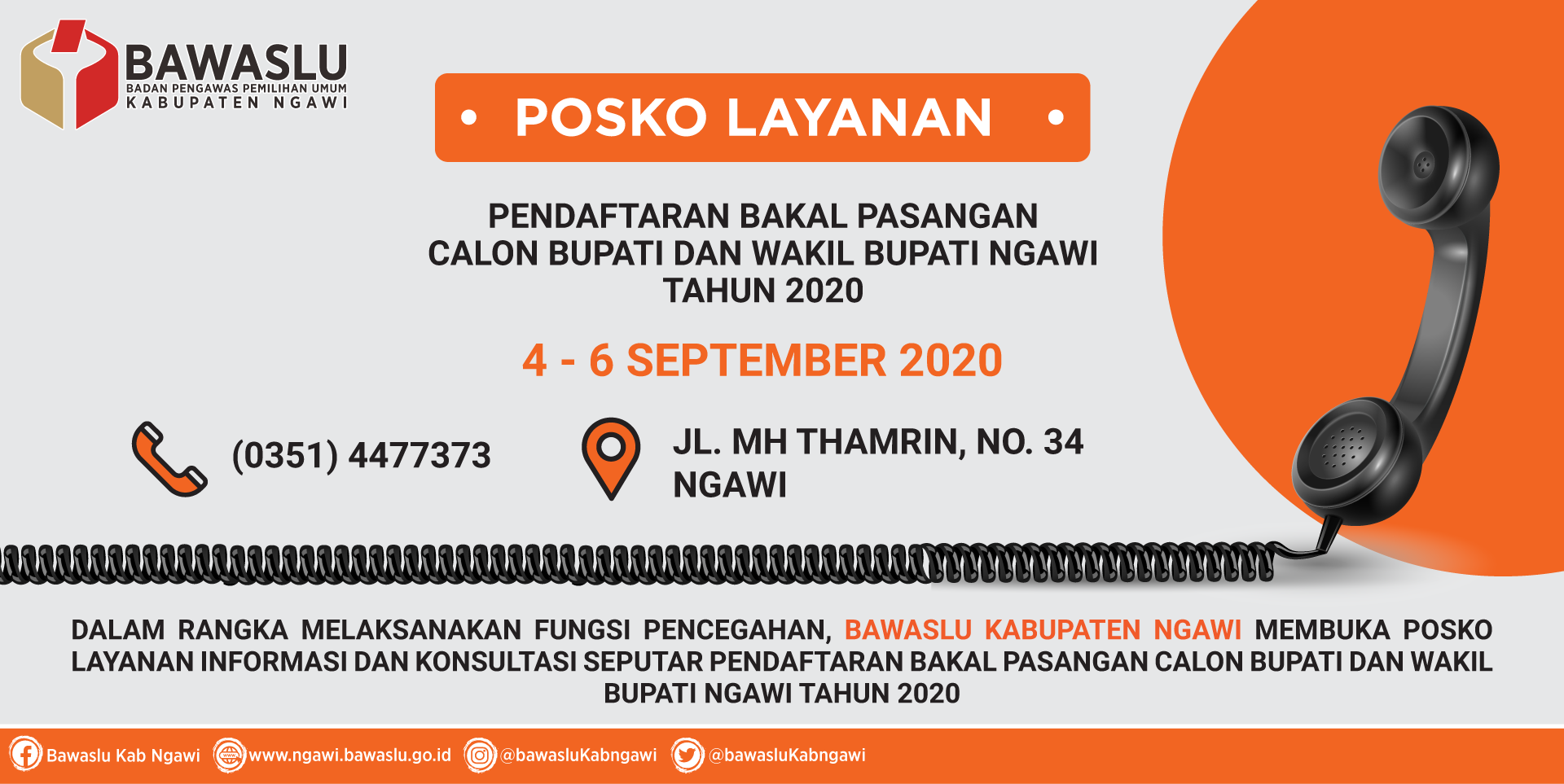 Ngawi Bawaslu Kab Ngawi . Badan Pengawas Pemilihan Umum Kabupaten Ngawi Pada Tahapan Pencalonan Pilkada 2020 Kabupaten Ngawi membuka Posko Layanan Pendaftaran Bakal Pasangan Calon Bupati dan Wakil Bupati Ngawi.