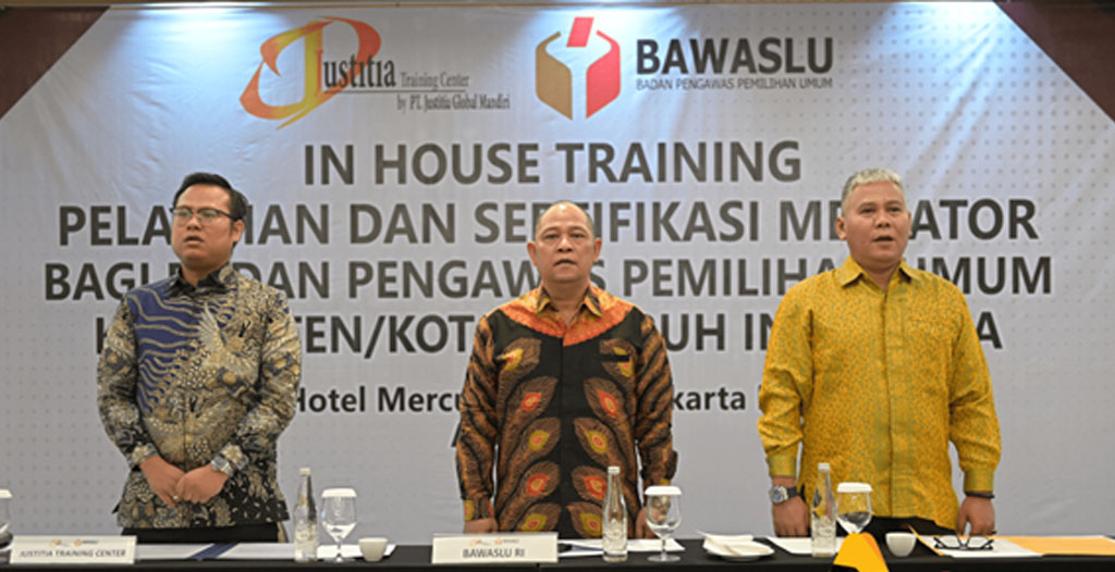 MediaJustitia.com: Setelah suksesi kegiatan Pelatihan dan Sertifikasi Mediator bagi Badan Pengawas Pemilihan Umum Republik Indonesia (Bawaslu RI), Justitia Training Center kembali dipercayakan oleh Bawaslu untuk menyelenggarakan Pelatihan dan Sertifikasi Mediator bagi 304 komisioner dan anggota Bawaslu Kabupaten/Kota seluruh Indonesia.